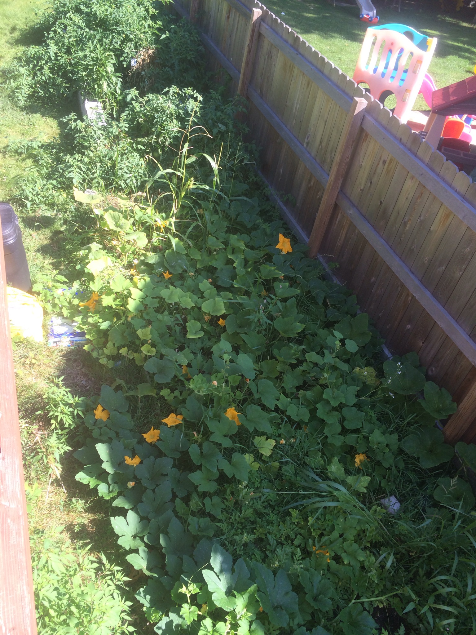 We have a pumpkin growing near our fence line and some buds for pumpkins, butternut squash and spaghetti squash growing up as well. I’m happy to report that numerous honey bees have been pollinating all of our flowers this year as opposed to the overall paucity of last year.